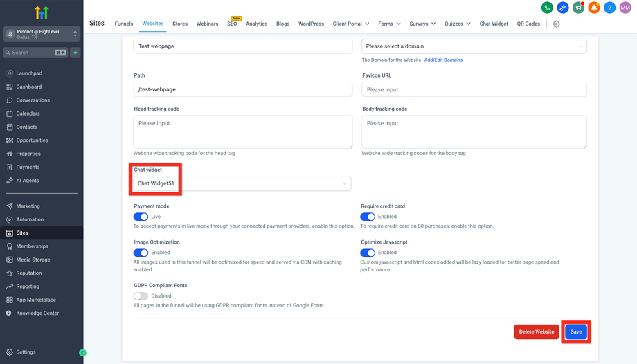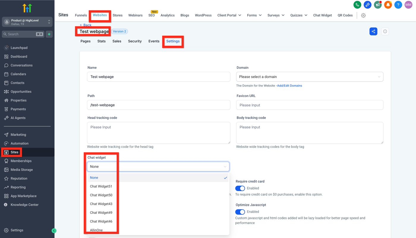 Navigiere zu Sites > Chat Widget
