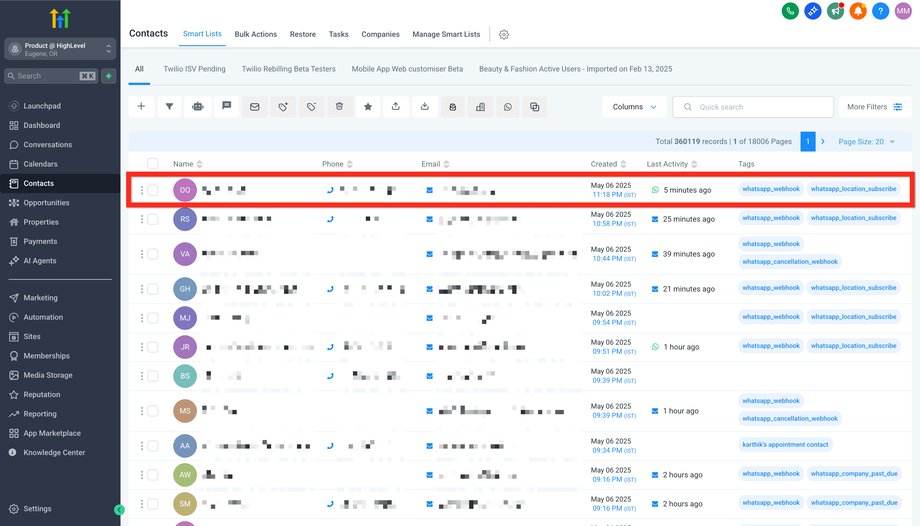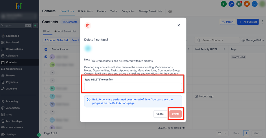 Das Löschen von Contacts entfernt ebenfalls die entsprechenden: Conversations, Notes, Opportunities, Tasks, Appointments, Manual Actions, Community Group Owners. Es stoppt außerdem alle aktiven Campaigns und Workflows für die Contacts. Gelöschte Contacts können innerhalb von 2 Monaten wiederhergestellt werden.