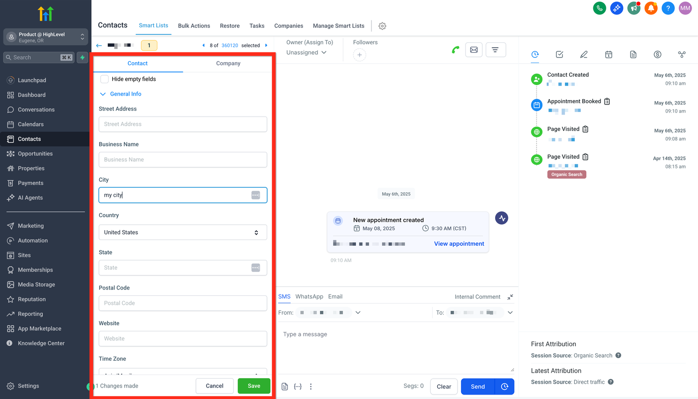 Gib die Contact-Details ein (Name, E-Mail, Telefon usw.). Denk daran: Je mehr Informationen du bereitstellst, desto einfacher wird es, deine Interaktionen zu personalisieren. Wenn du das Contact-Feld, das du ausfüllen möchtest, nicht siehst, verwende die Create New Custom Field-Checkliste.