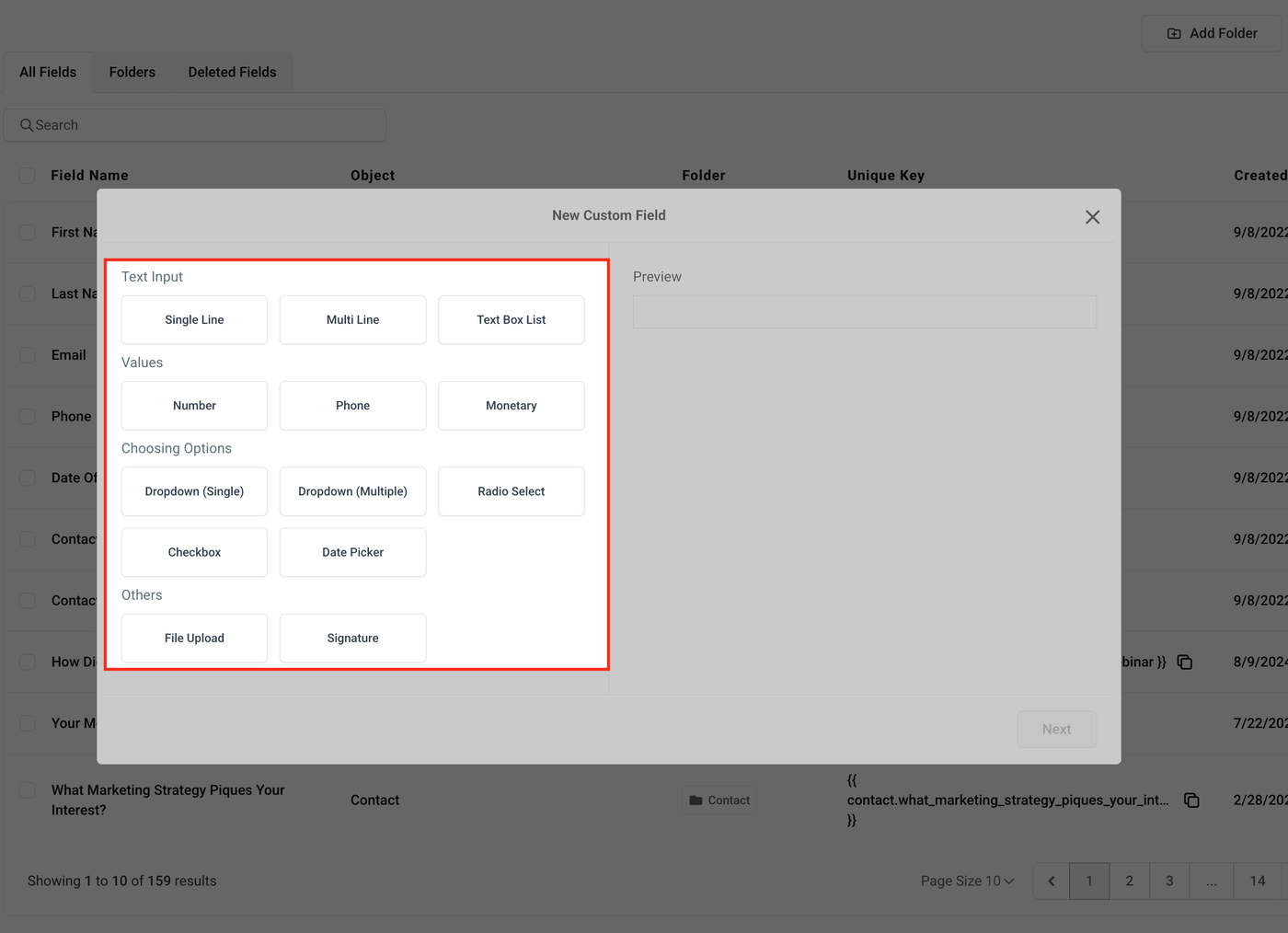 Wähle den Feldtyp aus, den du erstellen möchtest (z. B. Text, Dropdown, Datum).