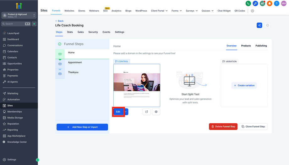Navigiere zu Sites und wähle, wo dein Produkt erscheinen soll: Website, Funnel oder Store.