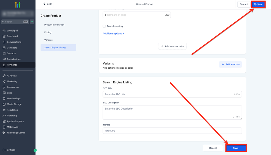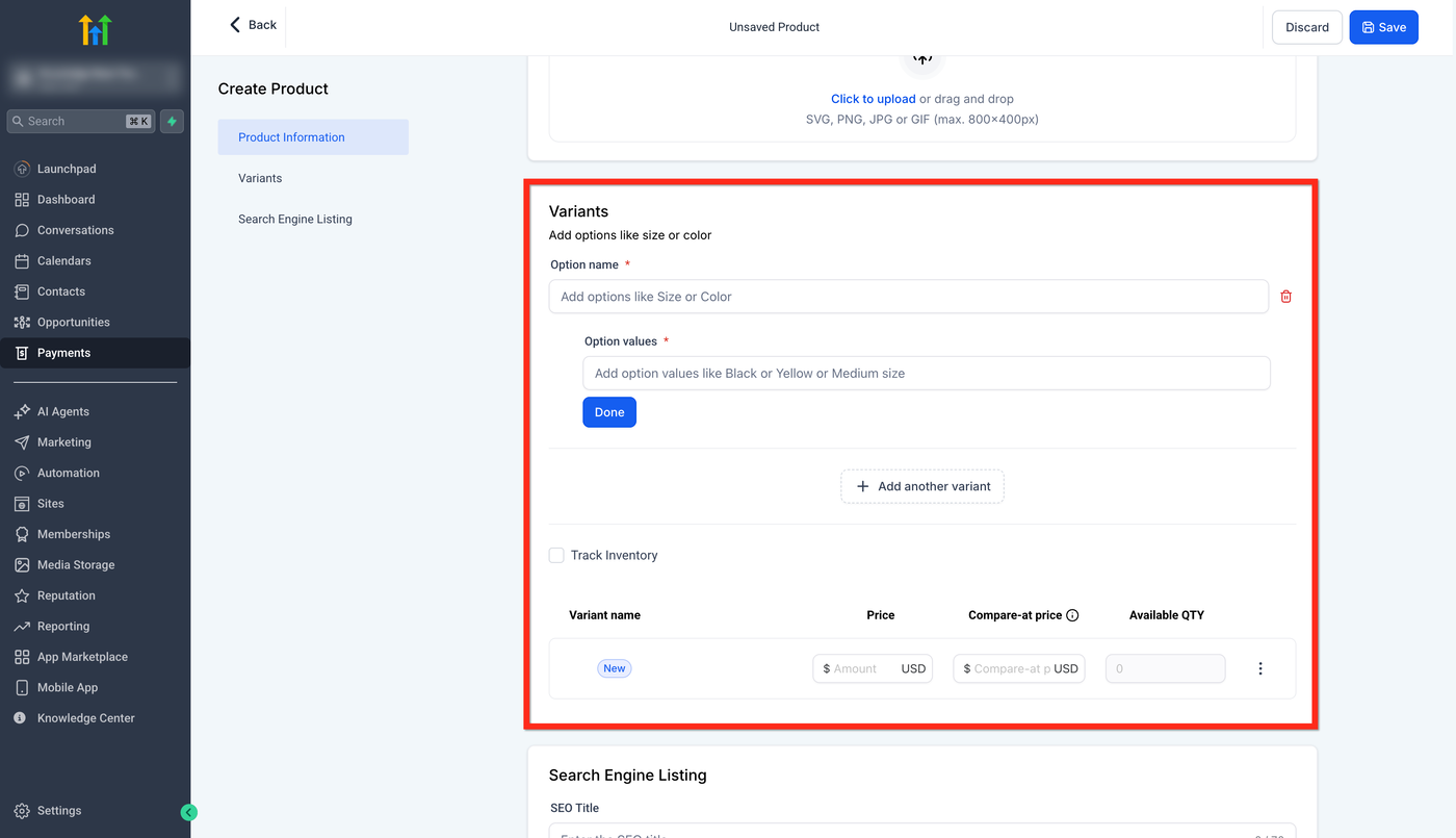Im Bereich Variants kannst du unterschiedliche Versionen eines Produkts erstellen, z. B. verschiedene Preisstufen, Inhaltslevel oder Zugriffszeiträume.