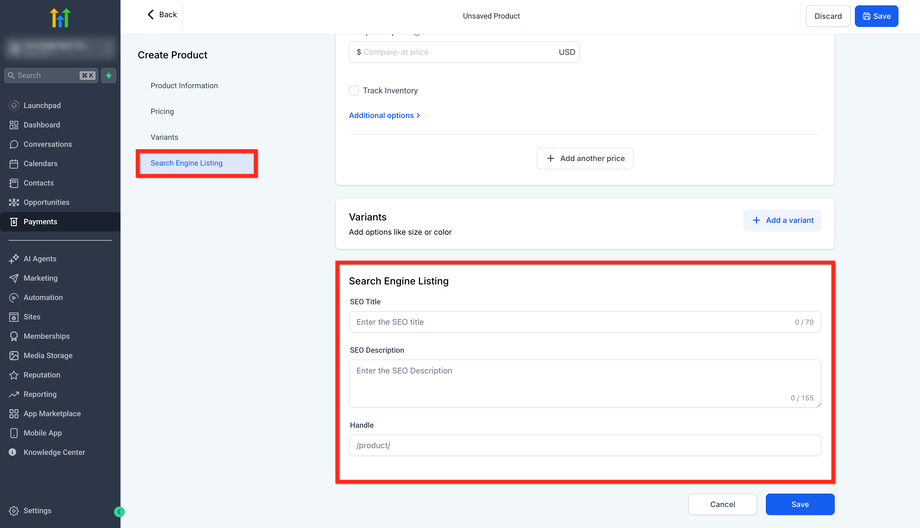 Der Bereich Search Engine Listing hilft dir dabei, dein Produkt für Suchmaschinen zu optimieren.