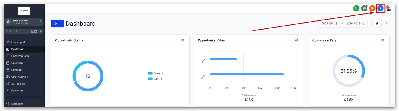 Wenn du ein Agency Admin oder Agency User bist, siehst du den blauen Button oben rechts auf dem Bildschirm, über den du Support von ProfitBoost erhalten kannst, wie im untenstehenden Bild gezeigt.
