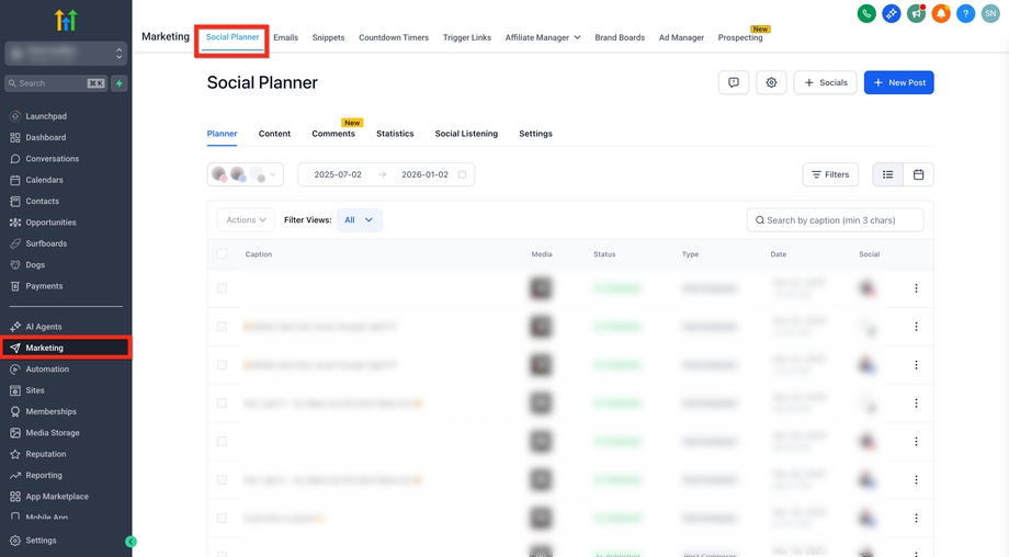 Navigiere im linken Menü zu Marketing > Social Planner.
