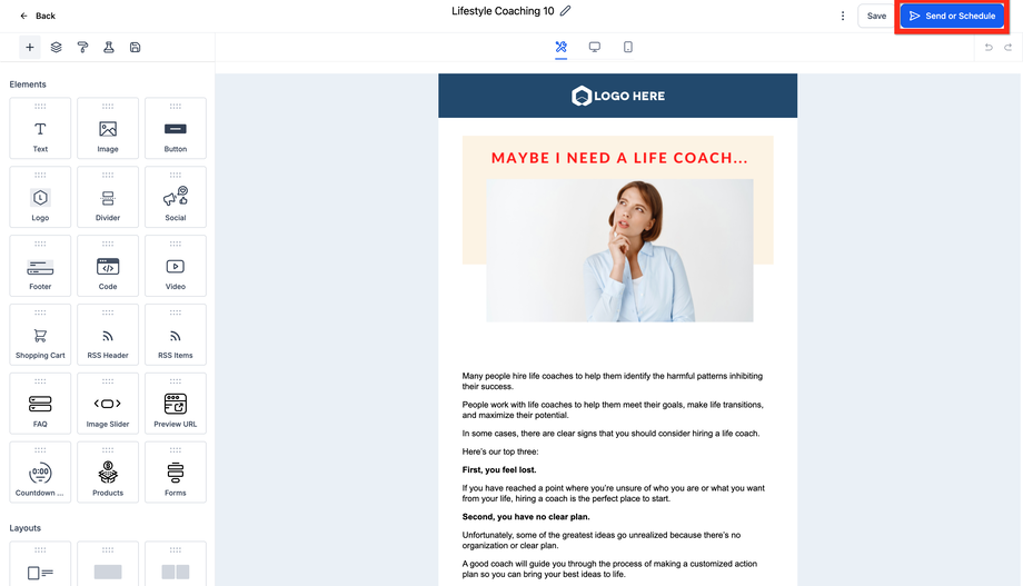 4 Mit geöffnetem Template klicke auf Send oder Schedule.