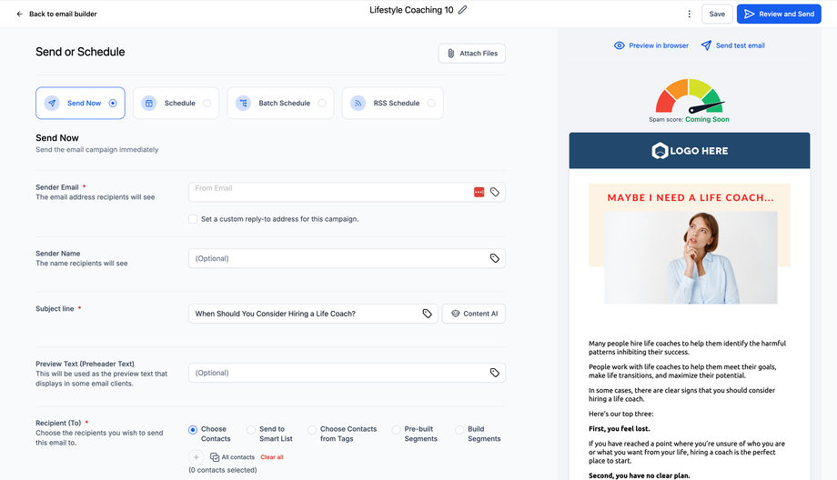 • How to send a Regular Email Campaign (Send Now or Schedule)