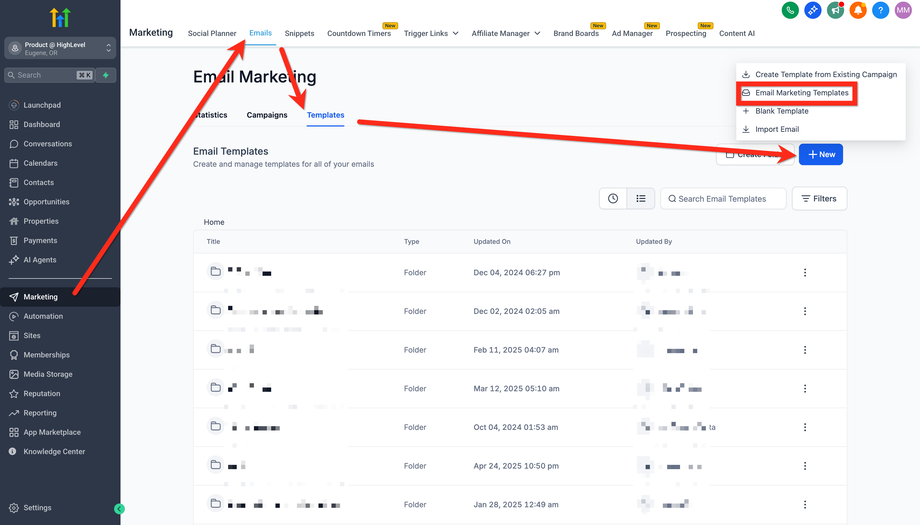 3 Oder wähle den Templates Tab > klicke auf das 3-Punkte-Aktionsmenü neben deinem ausgewählten Email-Template und wähle Create Campaign.