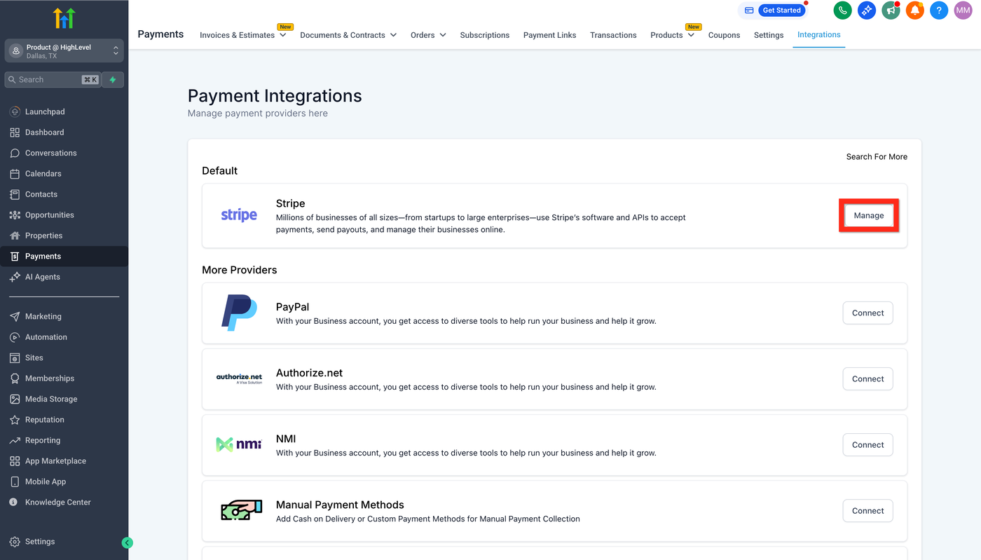 Navigiere zu Payments > Integrations. Dort findest du beliebte Optionen wie Stripe, PayPal, Authorize.net, NMI, Manual Payment Methods (z. B. Nachnahme, COD) und Square.