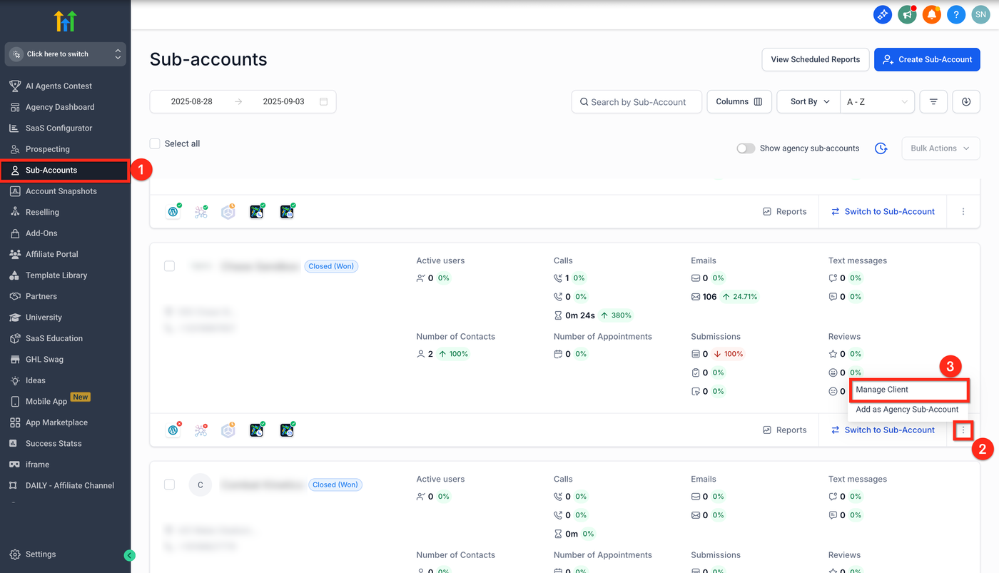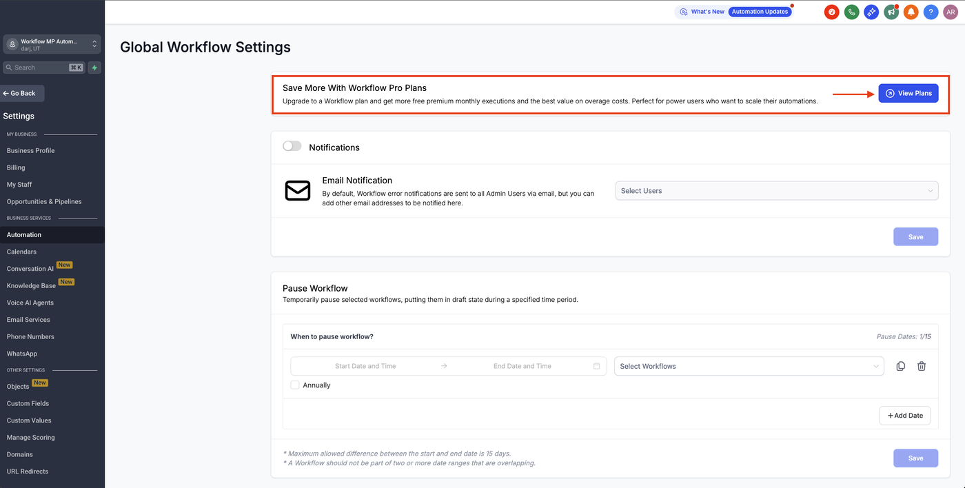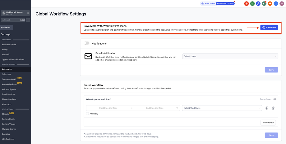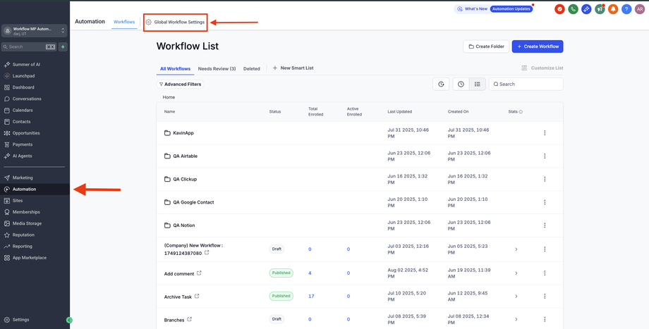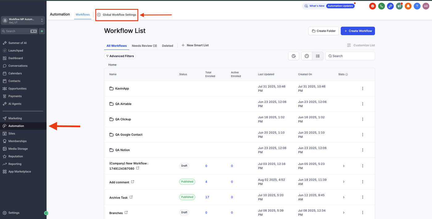 Gehe im Sub-Account zu Automations > Global Workflow Settings