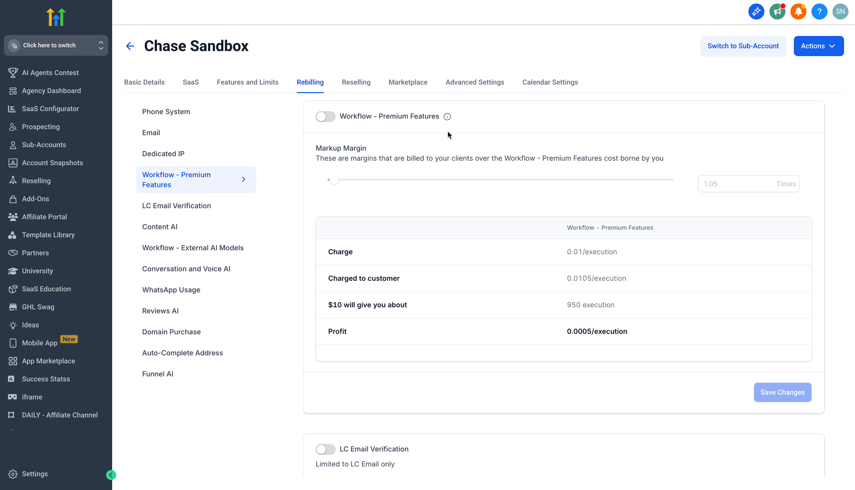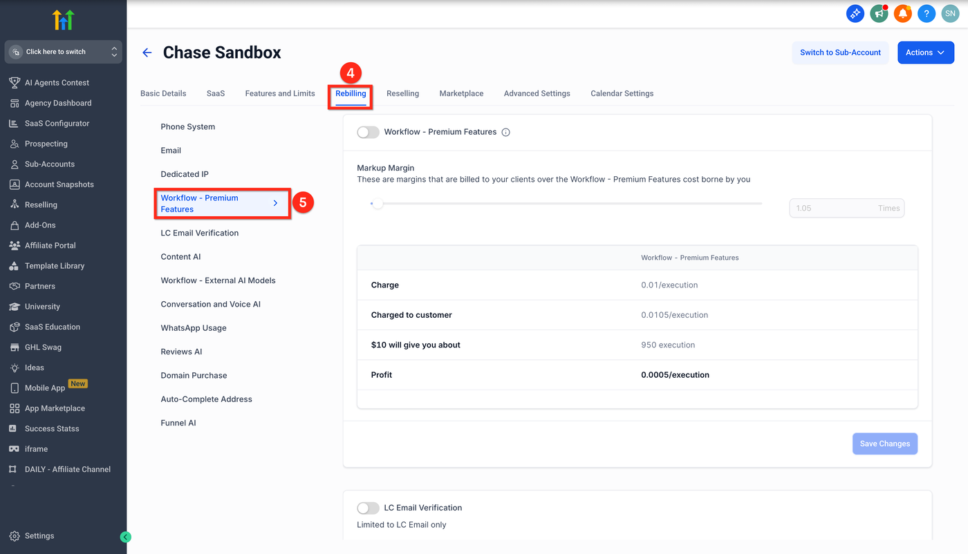 Einfache Reselling-/Markup-Workflows: Falls Rebilling aktiv ist, kannst du Premium-Usage an Sub-Accounts weitergeben oder aufschlagen